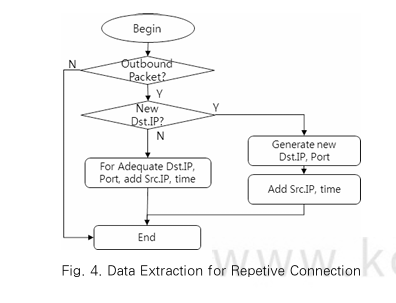 감염된 PC는 C&C 서버와 정기적으로 통신한다. 이를 분석하여 평균 접속 간격이 일정한 경우, 비정상 통신으로 간주한다. 특정 임게값(예: 평균편차 5초 이하)이면, 해당 IP를 C&C 서버로 의심 가능하다. 이 방식은 HDFS기반 저장소와 NoSQL 분석 시스템에서 효율적으로 작동하며 접속패턴을 많은 단위로 분석할 수 있어 장기적인 이상행위 탐지에 적합하다.