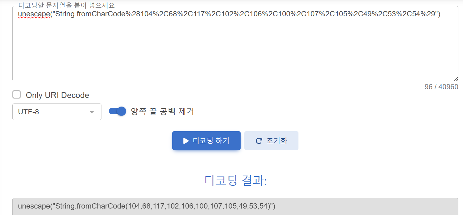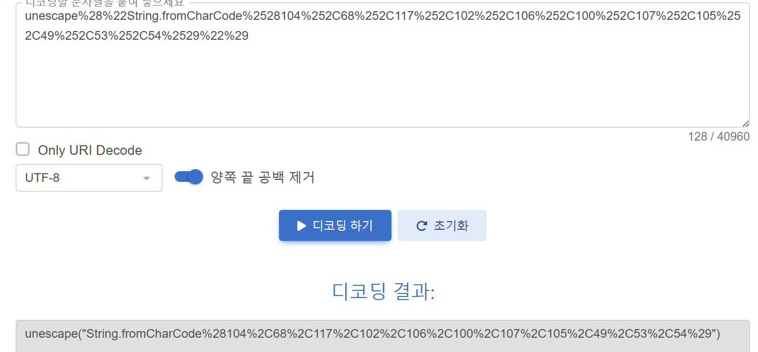 디코딩하기 위해 사이트에 들어가서 변환해주었다. 그 결과 처음 값과 달라지긴 하였지만 확실한 힌트를 얻을 수 있을 정도로 바뀌진 않았다. 여기서 아까 소스코드에 unescape가 두 번 들어간 것은 디코딩을 두 번 해야한다는 의미라는 것을 알 수 있다.