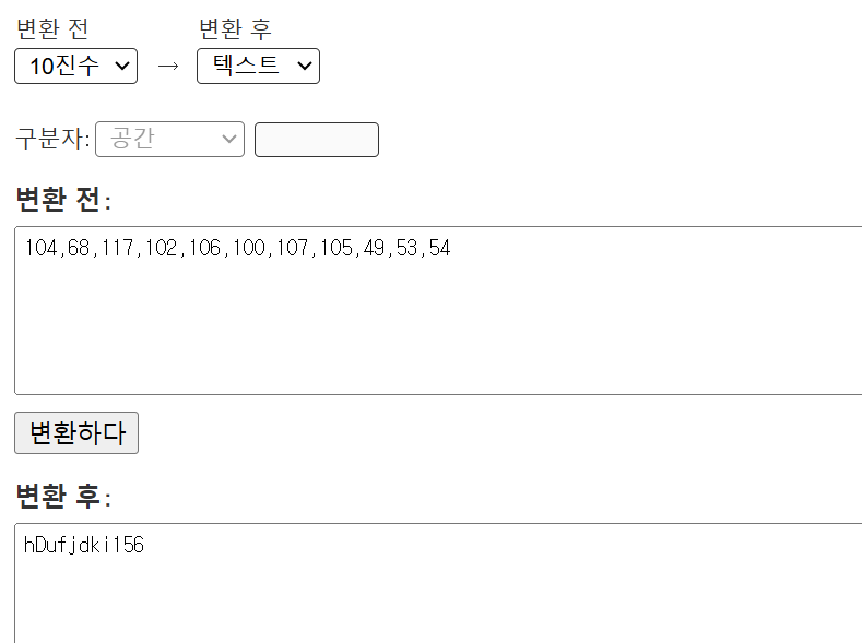 변환 사이트를 활용해 숫자들을 텍스트로 바꾸었더니 'hDufjdki156'이라는 패스워드가 나왔다.