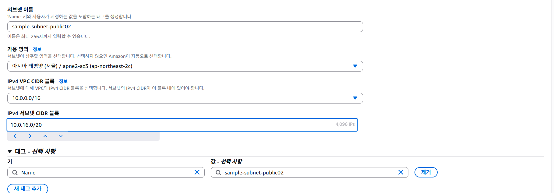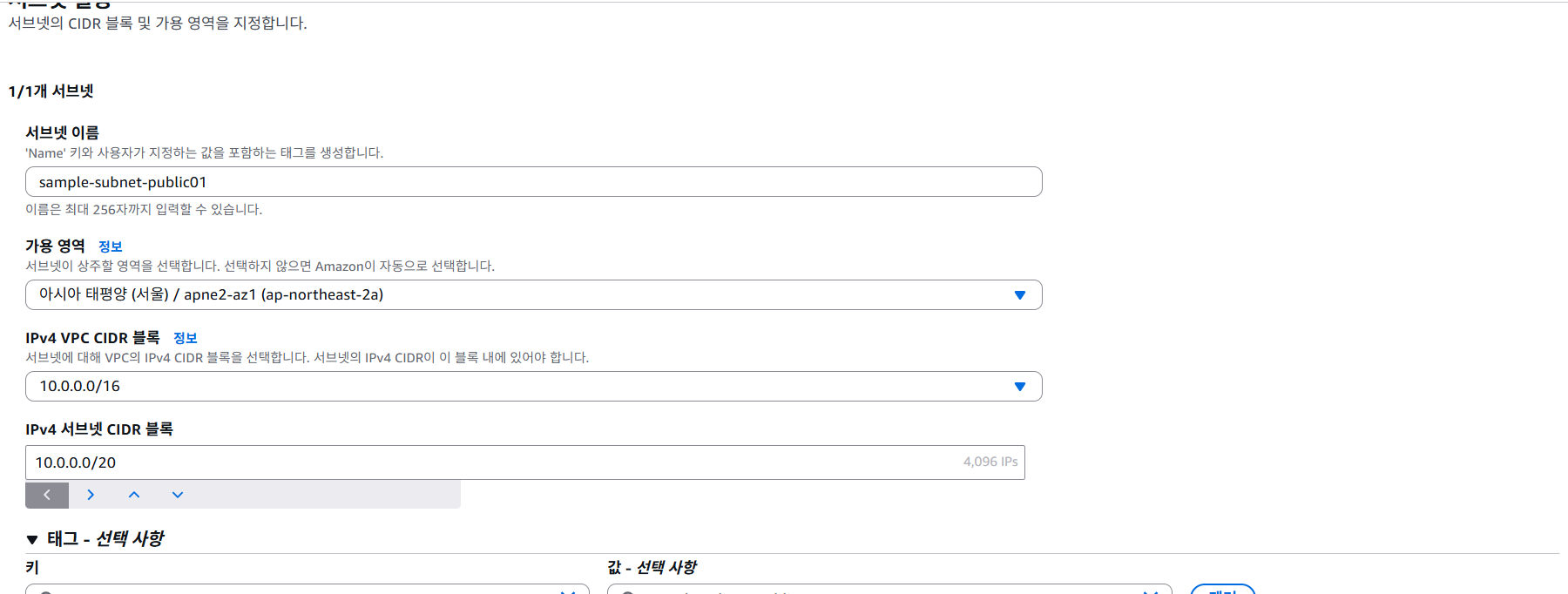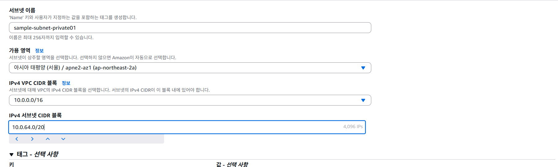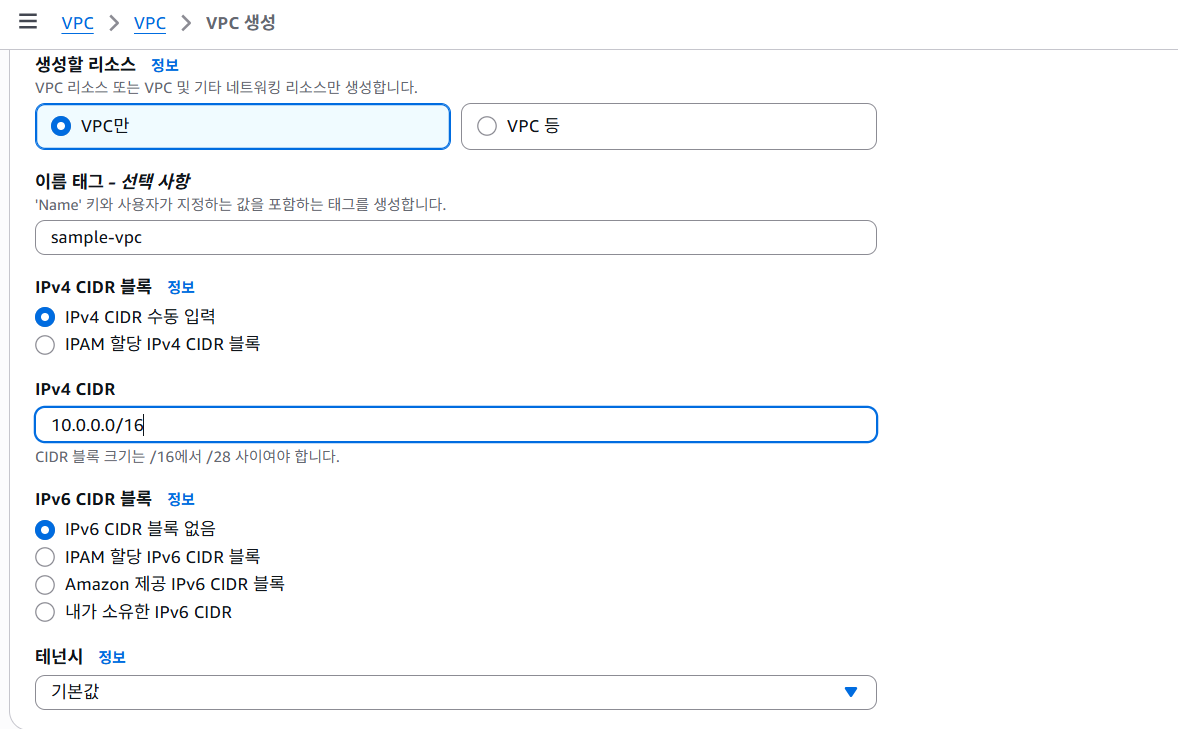- 이름 태그 : 실제로는 명령 규칙에 따라야 하지만 학습 목적이기 때문에 sample-vpc로 설정