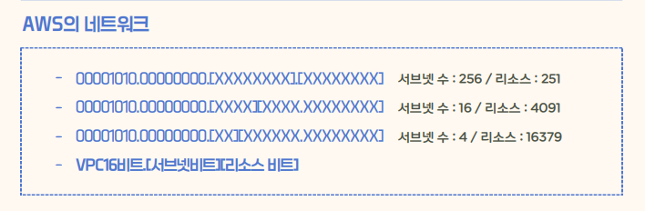 ※ VPC로 지정할 수 있는 서브넷 마스크는 최대 16비트까지이기 때문에 어떤 범위를 해도 큰 차이가 없음. 관리 편의성에 따라 IP 주소의 범위를 선택하면 됨