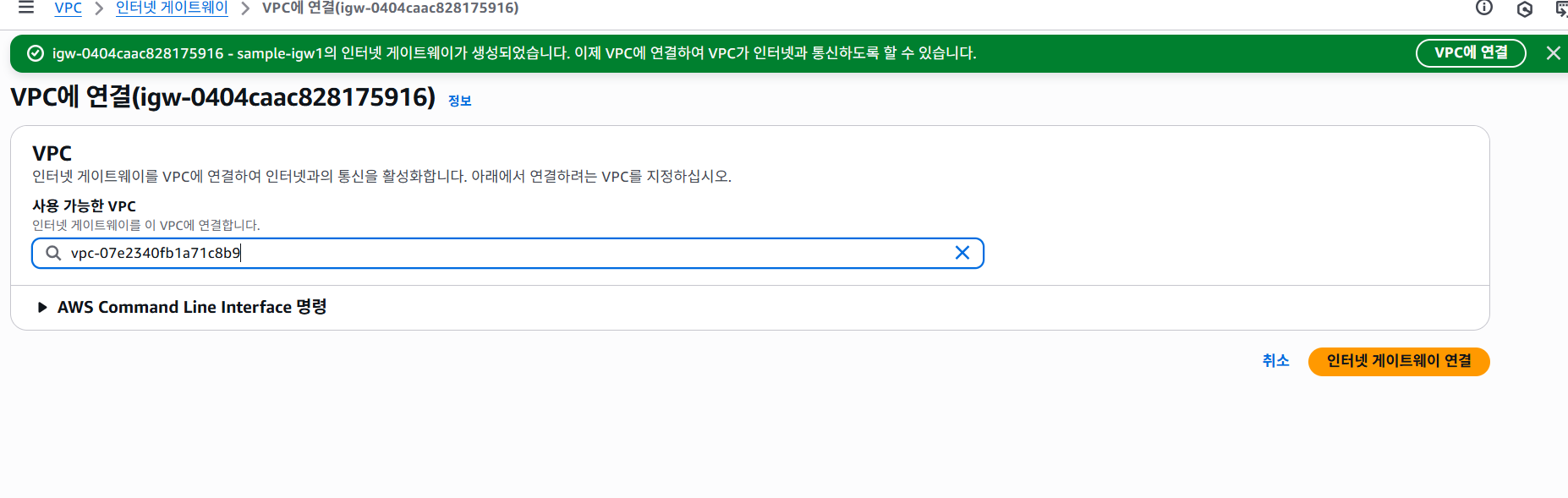 sample-igw1라는 이름으로 만들어둔 VPC에 연결.