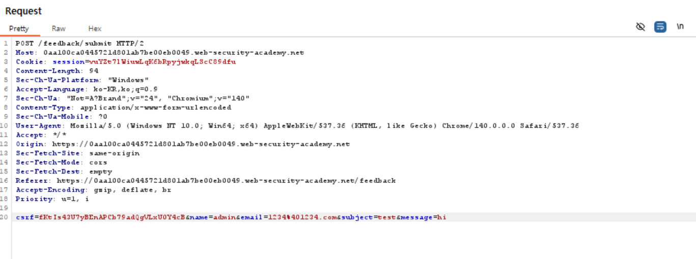 피드백 보내는 버튼을 클릭한 뒤 패킷을 확인해보니 내가 입력한 것들이 떴다. 해당 패킷을 repeater로 보냈다.
