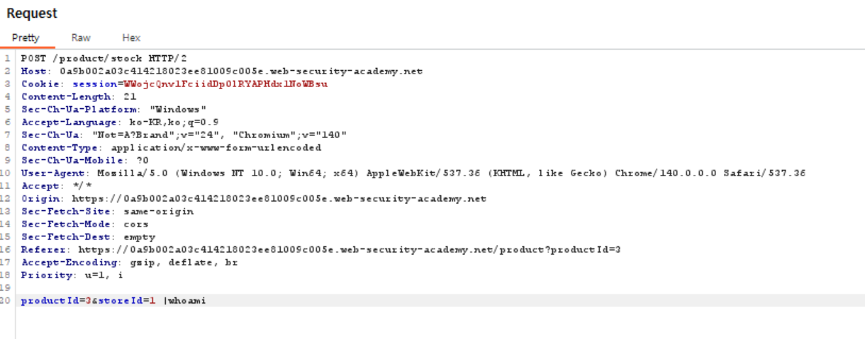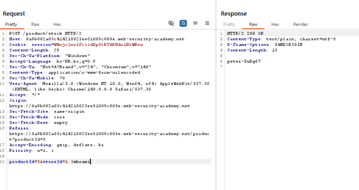 패킷을 repeater로 전송한 뒤 앞 명령어의 결과를 뒤 명령어로 이어주는 |와 사용자 이름을 보여주는 whoami를 입력한 뒤 send하였다.