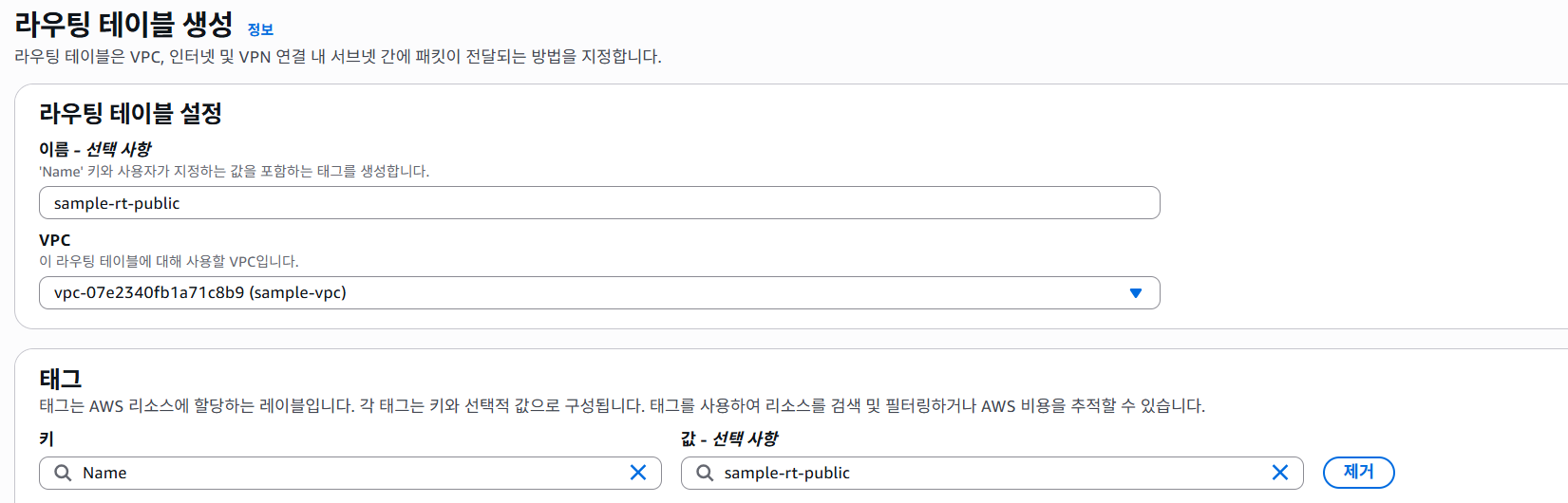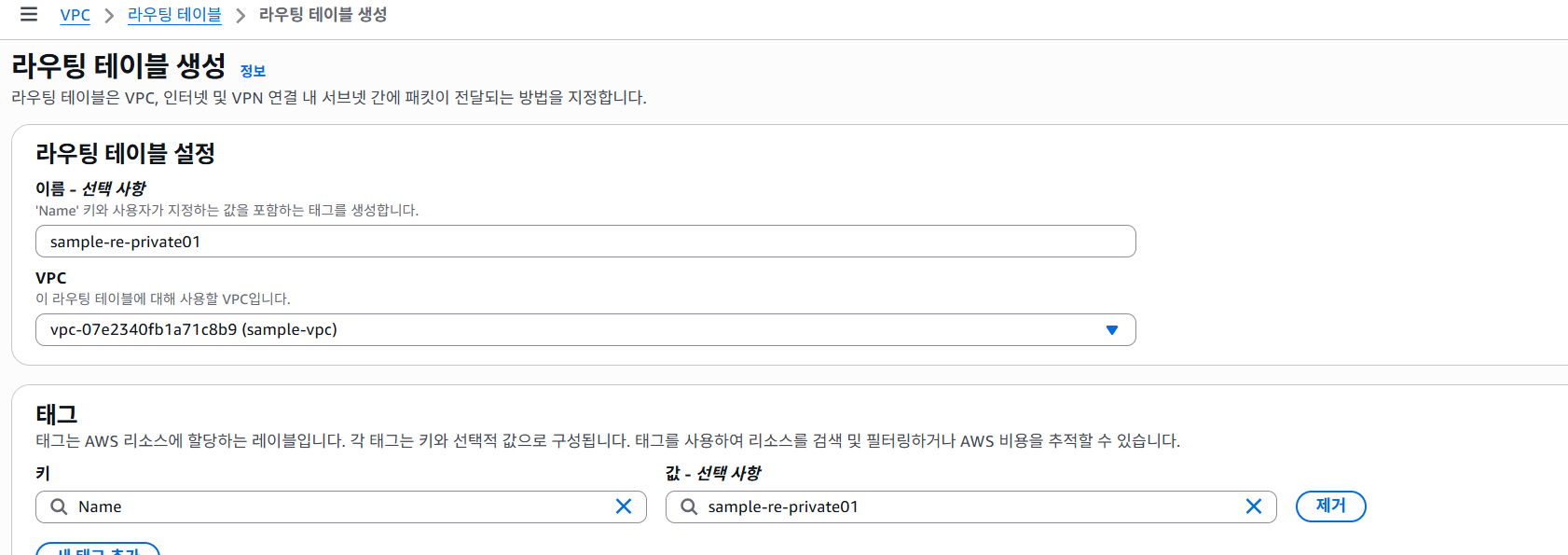 라우팅 테이블 이름만 private으로 변경하고 나머지는 퍼블릭과 동일하게 설정하여 생성