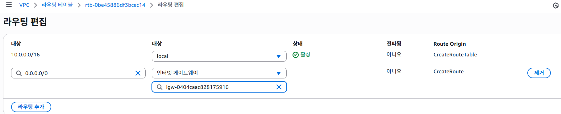 로컬은 자동으로 연결되어 있고 인터넷 게이트웨이를 위한 라우팅 추가를 함 → 길 연결 완료