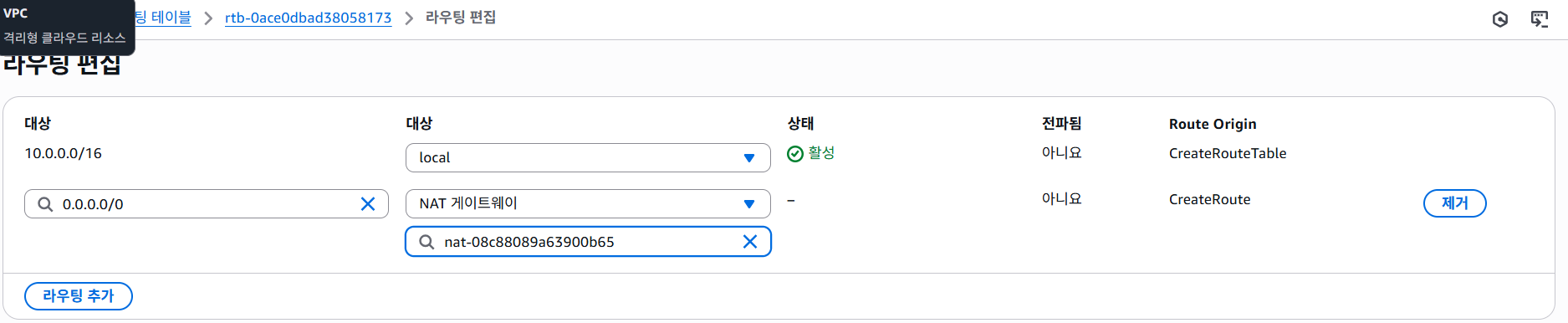 프라이빗은 NAT 게이트웨이와 연결해야하기 때문에 대상을 NAT로 설정한 뒤 라우팅 연결