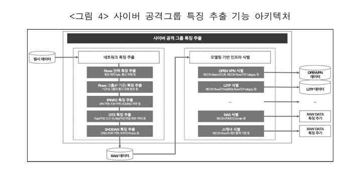 - 데이터 전처리 및 특징 추출 모듈 - 수집된 원시 데이터를 정제하고 불필요한 데이터를 제거한 후, 사이버 공격그룹과 네트워크의 특징을 추출하여 인프라 유형을 명확히 식별.