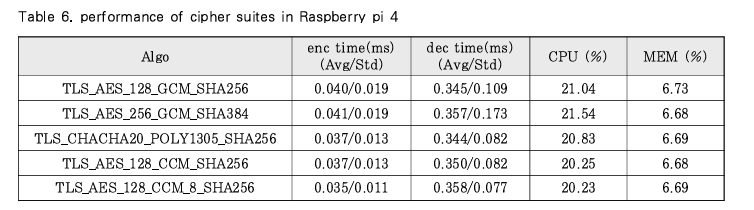 - 암호화 속도: TLS_AES_128_CCM_8_SHA256 (0.035ms)가 가장 빠름.