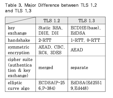- TLS 버전 1.3은 버전 1.2에 비해 Handshake 연결 속도가 약 39.94% 향상됨.