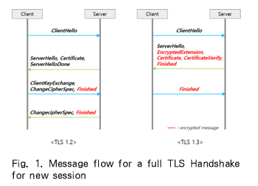 - TLS 1.3: Change Cipher Spec 같은 메시지 교환을 줄여 1-RTT로 단축 (총 7번의 Handshake 메시지 교환 가정).